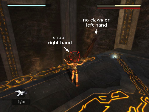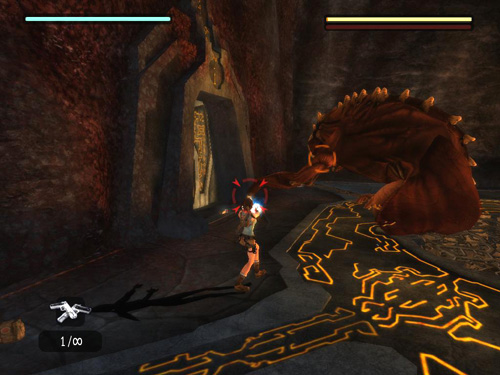 As you shoot, the mutant pounds its right hand on the floor, causing a series of tremors. If you jump just before each pound, Lara won't be knocked over.