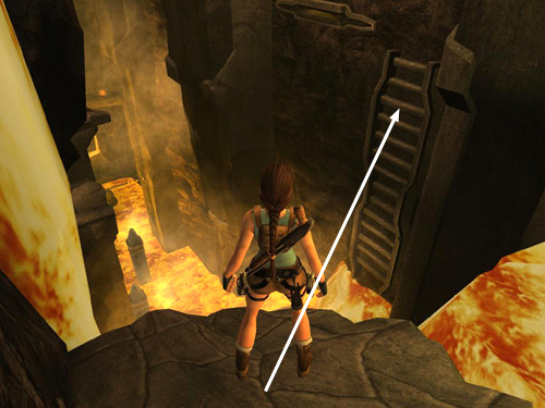 Stand on the left bank of the lava stream, looking downstream over the falls. Turn right and take a running jump across the lava pool far below to grab the ladder carved into the wall ahead.