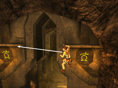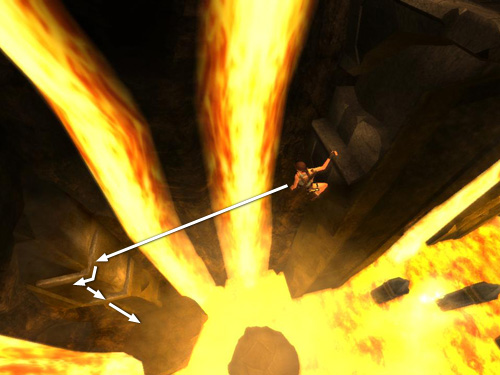 From there, jump back to grab one of the handholds on the square column beyond the double lava falls. Take care not to jump too close to the falls. The middle of this small ledge is a good take-off point. Climb around the corner to the right and drop down twice to reach the ledge below.