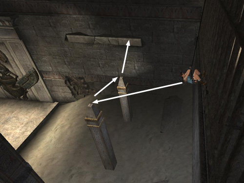 Lara's weight pulls it down, activating the mechanism, which opens the trapdoor in the floor, dumping a huge pile of sand into the ROOM WITH TWO RAISED OPENINGS below.