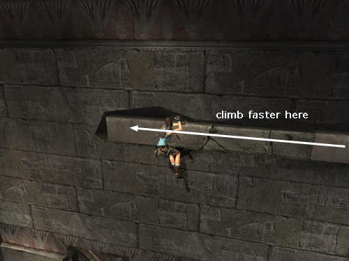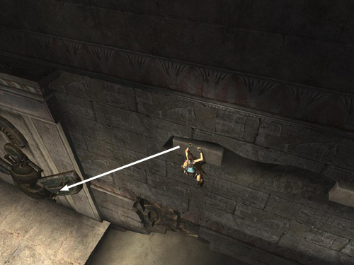 When Lara runs all the way to the left corners, jump back to grab the handhold on the wall behind and to the left.