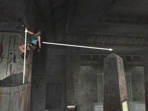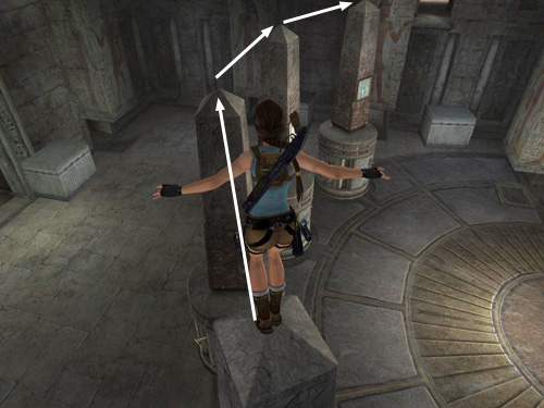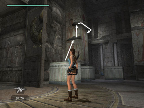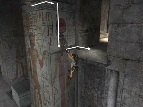 Climb to the right and jump to grab the horizontal crack in the next painted column. Climb around to the right so Lara's back is facing out toward the middle of the room.