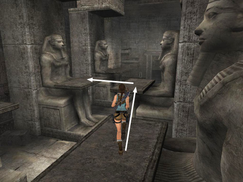 Quickly pull up, tap the HUD key if necessary to center the camera behind Lara, then run across the ledge and jump to grab the next one on the right side of the aisle. Pull up, turn left and take a running jump across the center aisle to the middle ledge on the other side.