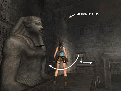 Climb onto the chunk of rock on the left and jump to grab the ledge on the first statue.