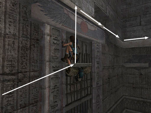 Jump to grab the top of the cage door and immediately jump up to grab the stone lintel above before the cage door descends too far. If you don't make it, you must repeat the whole timed run to get back to this point. Once Lara is hanging above the doorway, climb to the right and jump to grab the next narrow ledge. Climb around the corner and continue until you can pull up in the doorway.