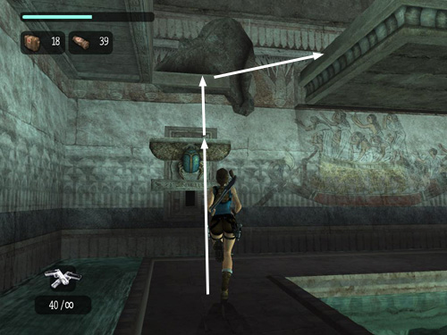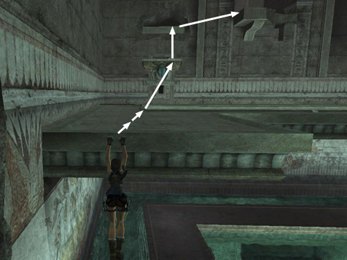Try to time your running jumps so Lara takes off at the edge of the ledge (near the spot shown by the third arrow in the screenshot above, though the ledge will have retracted quite a bit by then). Then hold down the Jump key to keep Lara in the air a little longer and try to grab the scarab switch on the wall ahead. If Lara misses the switch, she may still land on the retracting ledge that runs along the wall below it. If so, try and jump up to grab the scarab switch before the ledge retracts. (It's much easier to do this on either side of the switch, where the wings are, than in the middle where the beetle's body protrudes.)
