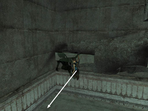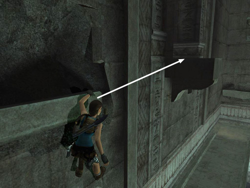 This ledge starts to retract into the wall as soon as Lara grabs it. So quickly pull up onto it (it may help to tap the HUD key in order to center the camera behind Lara first) and run to the right along the part of the ledge that juts out over the pool. (As with the other method, taking running jumps as you go may be helpful because the ledge then retracts more slowly, but don't bother if it makes it harder to control Lara.)