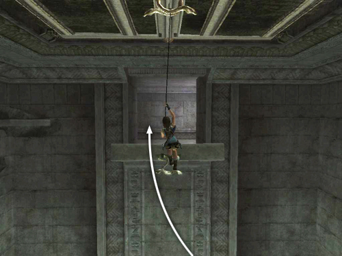 Turn to face out over the room. Notice the two metal rings: one on the ceiling, one on the far wall. Stand with Lara's back toward the barred opening just a step or so away from the edge of the ledge overlooking the room. Grapple the second ring—Lara should do this automatically, but you can use manual aim if necessary—and pull to lower a drawbridge-style ledge. Keep pulling on the cable until the ledge comes all the way down.