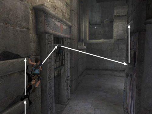 First climb the handholds to the left of the second cage. From the upper handhold, jump to grab the top of the cage door. Before it can descend, jump back to grab the lower handhold on the column behind. Then jump up to grab the handhold above.