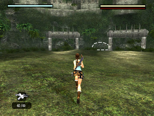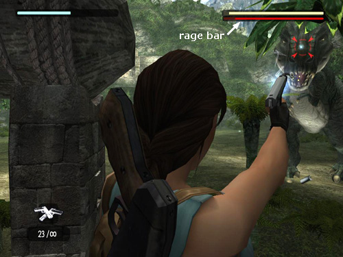 If you shoot at the rex long enough, his rage meter will max out and he may charge. Then Lara is in trouble. Instead shoot until the rage meter almost reaches the maximum (as shown above), then stop shooting, wait for the beast to calm down before starting to shoot again. Killing the big dinosaur this way takes a while, but when you have finally whittled its health bar down to near zero, the next cut scene starts.