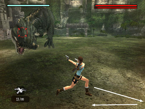 Instead, start by luring the T. rex away from the safe spot. What worked best for me was to run for the spiked log to the left of the safe spot (i.e., to the right if Lara's back is toward the two spiked logs, as shown in the screenshot above). If possible, shoot at the T. rex as you go until it becomes enraged (as described in the main walkthrough). Wait for the dinosaur to charge and then dodge to the left (i.e., toward the safe boulder).