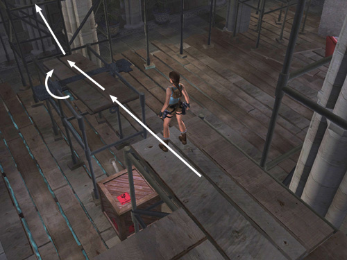 After shooting the pulley anchoring the seesaw planks and moving the wooden crate between the two sets of scaffolding, climb onto the crate to reach the scaffolding on the right, where the crate originally was. Take a running jump onto the seesaw planks. As they start to tip, run up the slope and jump . . .