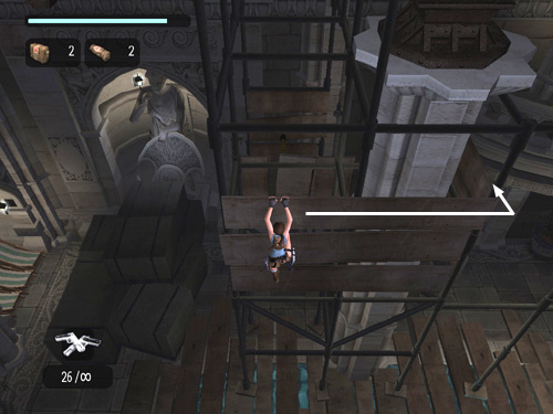 Climb to the left a bit and then jump backward to reach the balcony. Shoot the pulley holding the third rope supporting the archer statue. The statue crashes through the floor into the pool below. Drop down off the balcony.