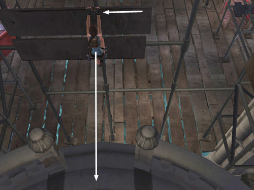 Jump back to grab the boards attached to the scaffolding behind and to the left. (These boards face the curved balcony.)