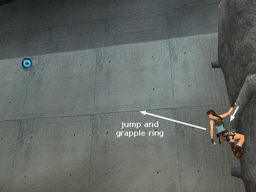 While hanging onto this crevice climb as close to the wall as Lara will go. Jump back and quickly press the Grapple key to hook the metal ring on the wall above.