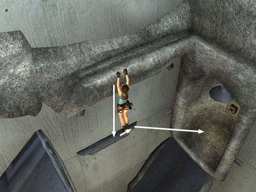 Start by moving the camera to the side so it's pointing more or less directly at the wall. (As you get better at this technique, you'll be able to do it instinctively without much fiddling with the camera.) Alternate pressing the Left and Right keys to make Lara run back and forth along the wall.