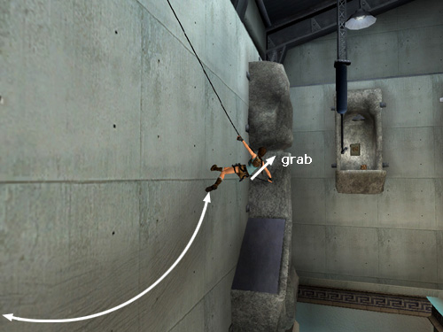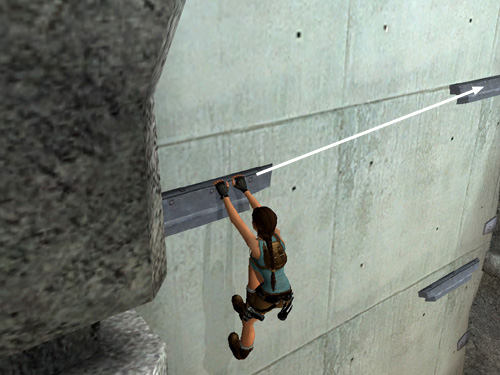 Climb all the way to the wall and then jump back and grapple the metal ring above. Use the grapple to wall run back and forth until Lara is running high enough to jump and grab the horizontal crevice on the rock column ahead (above the ramp).