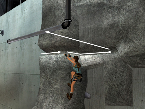 Drop and grab the metal handhold below. Then climb to the right . . .