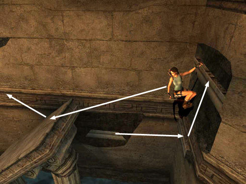 NOTE: If you're playing the PC version of the game, you can probably skip the handhold and jump from the vertical beam directly to the slope, as indicated by the broken arrow in the screenshot above. This doesn't seem to work in the PS2 game.