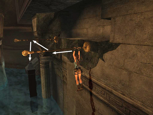 Once Lara is hanging from the first pole, adjust her position left to right and swing over to the second pole. Swing and jump onto the pointed vertical beam sticking out of the water.