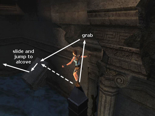 Turn right and jump to grab the handhold on the wall. Climb to the left and jump onto the small slope. Before Lara can slide into the pool, quickly jump to land in the little alcove on the side of the pillar.