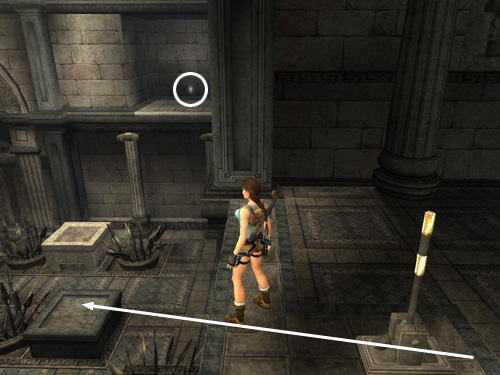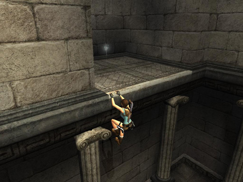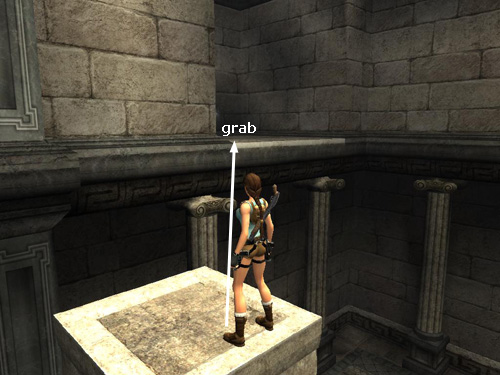 Watch the light-colored pillar ahead (i.e., between the low block and the alcove with the artifact) as it begins to rise. When it's a little higher than Lara's head, take a running jump to grab the edge. The pillar should continue to rise a little bit. As it does, pull up . . .