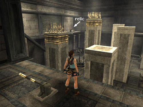 Run across the ledge, veering slightly to the left (toward the wall) as you go, and jump to grab the edge of the alcove containing the relic. It's a long jump, but if you press the Jump button right at the edge of the ledge and hold Jump while Lara is in the air, she'll make it. She'll catch the ledge with only one hand, though, so quickly press Interact to do a saving grab.