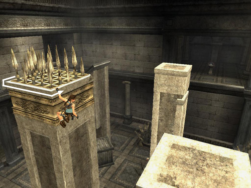 Return upstairs to the alcove with the lever and take a running jump to land on the right side of the first flat-topped pillar. It starts to descend immediately, so turn left and take a running jump to grab the top edge of the spiked pillar.