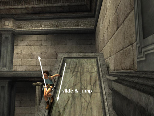 Turn right and take a running jump to grab the spiked pillar ahead. Lara may grab the top of the pillar but if she misses and grabs the horizontal crevice partway down, just jump up to grab the top.