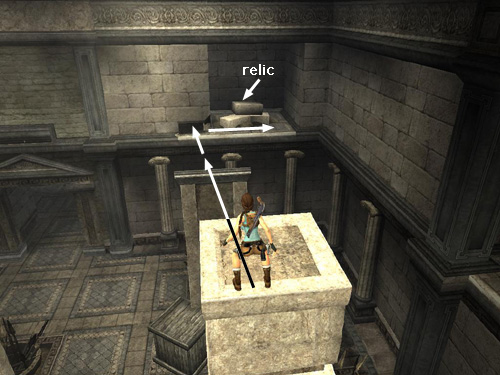 . . . to land on the flat-topped pillar behind. It starts to descend, so tap the HUD key to center the camera behind Lara. Then immediately run forward and jump at the edge to land on the sloping pillar ahead.
