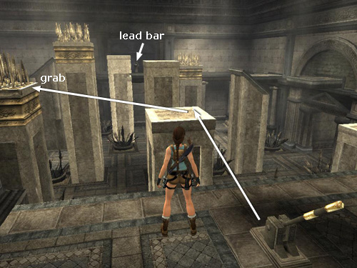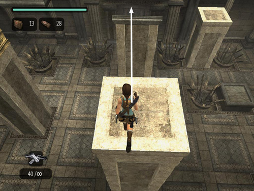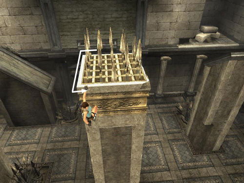 . . . to land on the flat-topped pillar behind. It starts to descend, so tap the HUD key to center the camera behind Lara. Then immediately run forward and jump at the edge to land on the sloping pillar ahead.