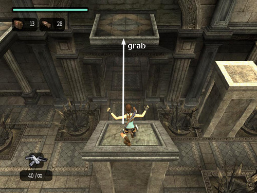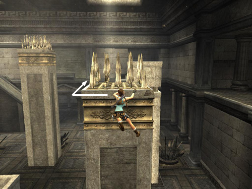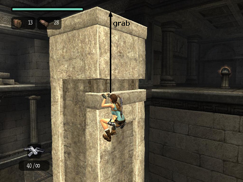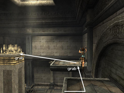 Position Lara as close to the left edge as she'll go. Jump back to grab the narrow horizontal shelf on the pillar behind.