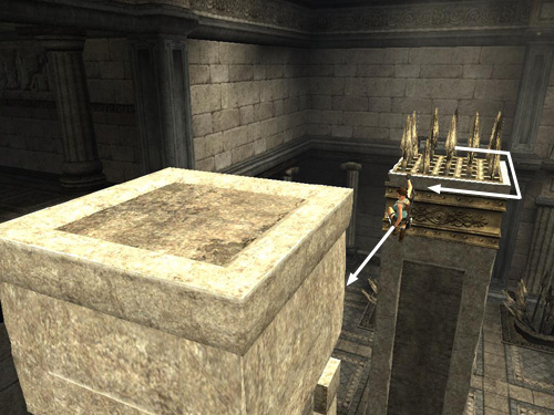 Quickly pull up, turn left and take a running jump to grab the next protruding ledge. This one also starts to move back into the wall, so pull up, turn left and take a running jump to grab the top of the spiked pillar ahead. Now you can take your time again.