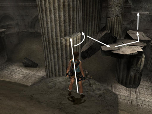 Jump to grab the crack on the right side of the center column. Climb around to the right and jump back to land on the flat spot behind. Cross the broken floor to the left wall and grab the lower handhold.