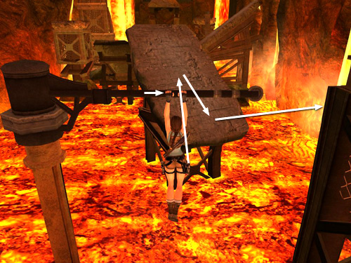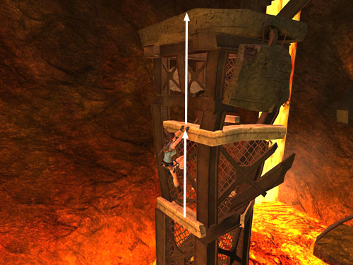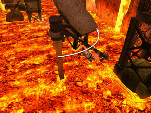 If Lara is too far to the left or right before swinging around the bar, she'll miss the next grab and fall into the lava. So adjust her position so she's hanging directly in front of the nearest corner of the ramp (as shown above). Swing around the bar, jump onto the ramp, slide just a little bit and jump to grab a handhold on the support pillar ahead.