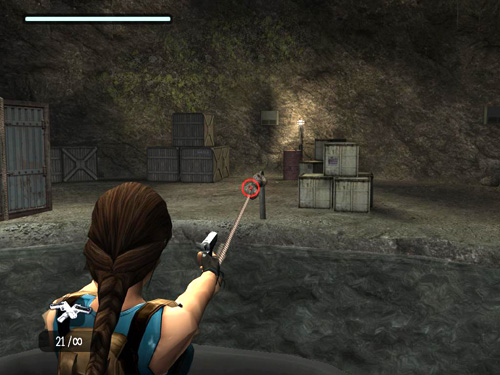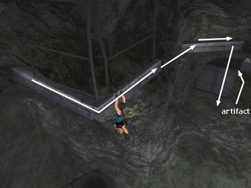 Climb all the way around the corner to the right until you can't go any farther. Then jump to grab the next handhold. Climb all the way to the right and drop onto the ledge below. This is the raised cave with the "Natla Technologies" crates that you couldn't reach from below. Go behind the nearest crate to find ARTIFACT #2.