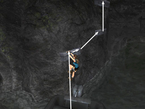 As you float along, face in the direction you're moving. Then, when the dinghy approaches the metal handholds on the left wall, hop up onto the motor and jump to grab the first handhold. Climb to the right and jump to the next handhold. Jump up to the one above.