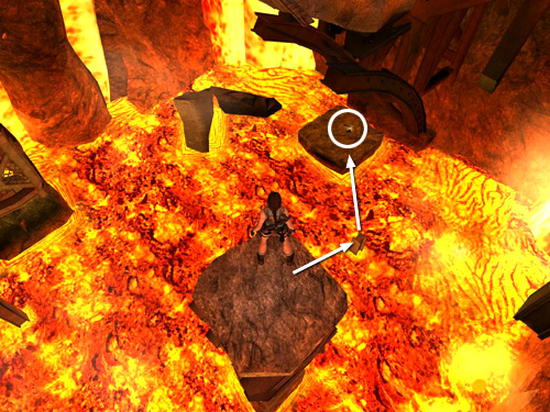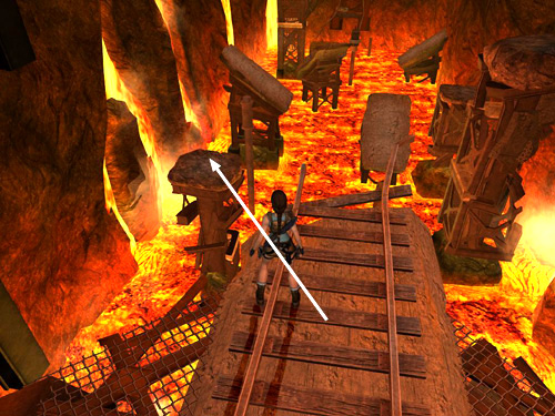 From the broken tracks jutting out above the lava, take a running jump to the broken support column ahead on the left.