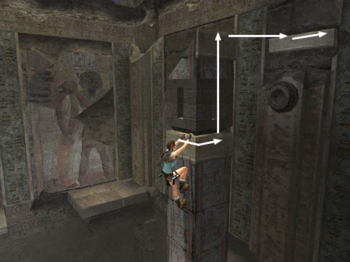 Climb around to the right and jump backward across the gap to grab the top of the broken square pillar behind.