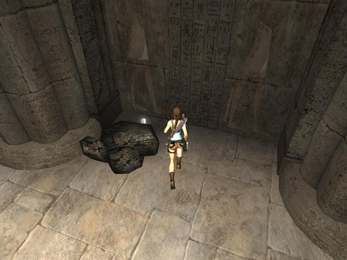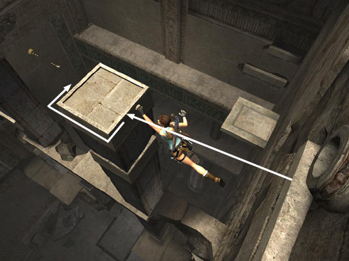 Jump back to grab the top of the square pillar behind. Do not drop down. If you do, Lara won't be able to make the next grab. Do not climb on top of the pillar or Lara will be in the path of the darts. Instead climb around to the other side of the pillar.