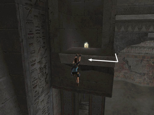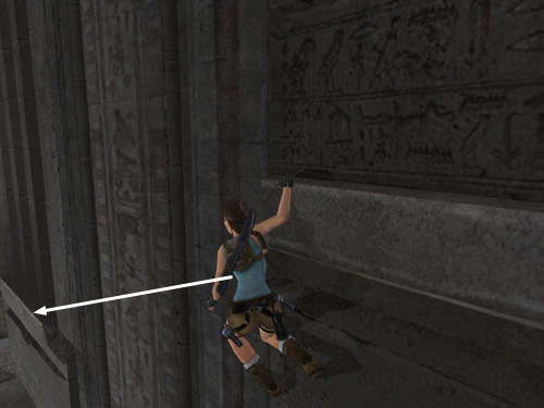 Take a running jump from the doorway to the square ledge in the corner. Grab the handhold on the wall above and climb to the left. Drop to grab the handhold below, climb to the right past the broken section of the upper handhold. Then jump up to grab the solid section of the upper handhold.