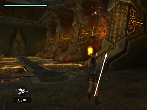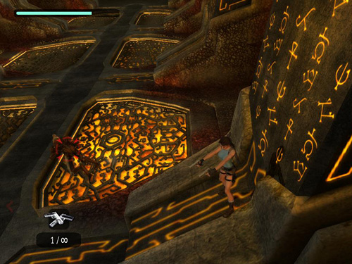 Run forward into the room and jump up onto the base of one of the vertical ceiling supports. If you head for the support on the right and draw guns as you run, Lara can begin firing at the flying mutant, which hatches just in front of you, then do a powerful forward flip right up onto the support. The cats can't reach Lara up here, so focus on the flyer. Try and take it down before it can grab her. If that does happen, tap the Left and Right keys in rapid succession (or waggle the control stick back and forth).