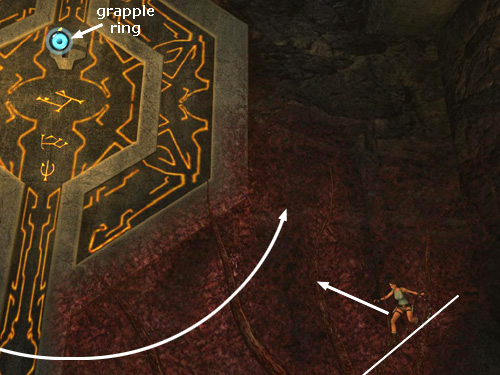 As she nears the wall, release the Forward and Jump keys and press Grapple to snag the ring above. This may take a number of tries, but once you succeed, you'll have much more time remaining than you would if you'd used the poles.