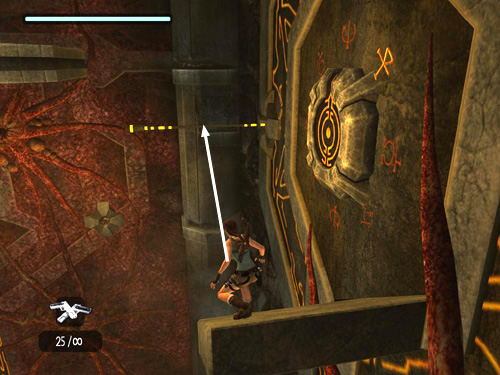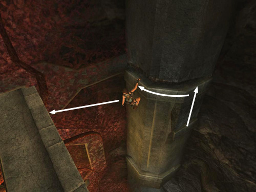 The screenshot above shows an overview of the whole sequence. Begin on the right side of the ledge, near the wall, facing the broken support column in the corner. Shoot the button again until all of the glyphs are lit. Take a running jump toward the broken column. Make sure you jump just at the edge of the ledge and hold down the Jump button to keep Lara in the air as long as possible. Then she should land near the middle of the slope.