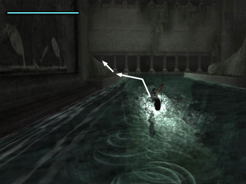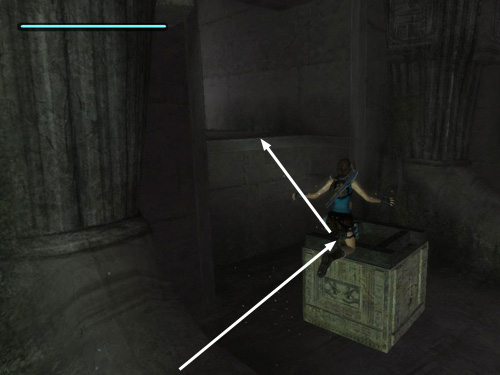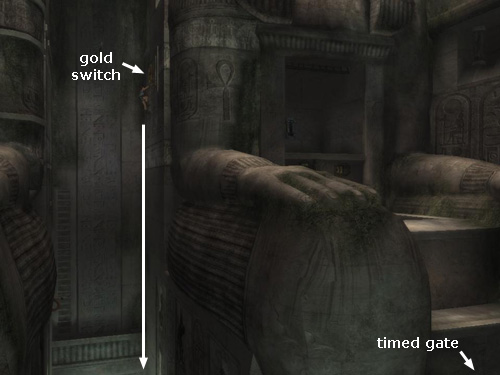 After pushing the carved block off the ledge in front of the Horus statue and then using the lever between the two statues to lower the water level once more, climb the Anubis statue and make your way over to the gold switch on the side of the Horus statue, as described in the walkthrough.