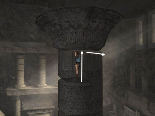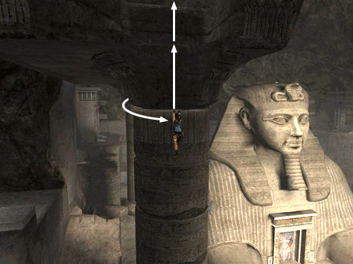 Climb around to the right again so the sphinx is ahead on Lara's right. Jump up to grab the broken top of the column, pull up and vault up onto the ledge ahead.
