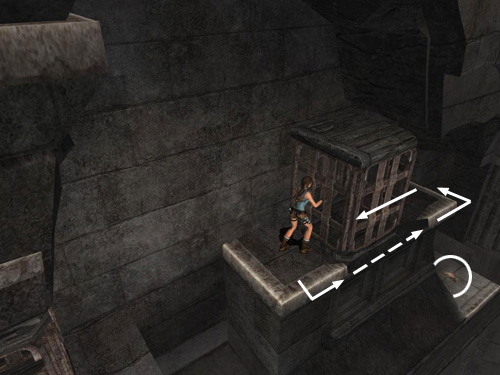 Pull the first metal box as far as it will go. You may have to ease it out gradually to keep it from sliding back. Hang from the edge so Lara's back is toward the open room. Climb to the right and jump past the gap in the ledge to grab on the other side. Climb around to the right and drop down near a small medipack. Return the way you came to the end of the fallen column between the two metal boxes.