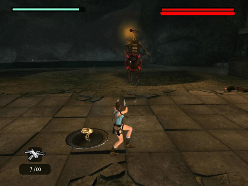 When the centaur you're attacking becomes enraged and starts to stare green rays at Lara, run to the shield and press Interact to pick it up. If necessary, press Left/Right to pivot on the spot and face the centaur. (Lara can't run with the shield, only pivot.)