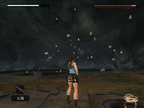 You only have a few seconds to act, so if you have ammo available, switch to more powerful weapons during the brief cut scene that shows the centaur being petrified. The first you petrify a centaur, Lara automatically drops the shield after the cut scene. So as soon as you regain control, run toward the petrified centaur shooting. Try to do as much damage as you can before it revives. Then switch back to regular pistols and start the process again. Subsequently, you need to drop the shield yourself by pressing Interact. (In these screenshots, I've already damaged the centaur with other successful attacks, so its health bar is low.)