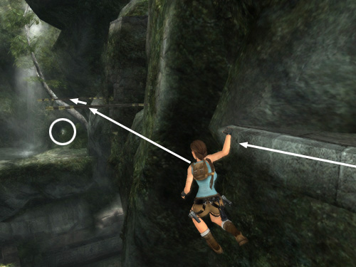 Climb to the left then jump to grab the nearest horizontal bar. Swing, jump and grab the next bar. Then swing and jump to land on the ledge next to the small pool feeding the waterfall. Another pair of bats attacks, though they may get stuck under the ledge. You should be able to draw them out by walking to the opposite edge. Pick up ARTIFACT #1, which is circled in the screenshot above. (The main walkthrough covers getting back down.)